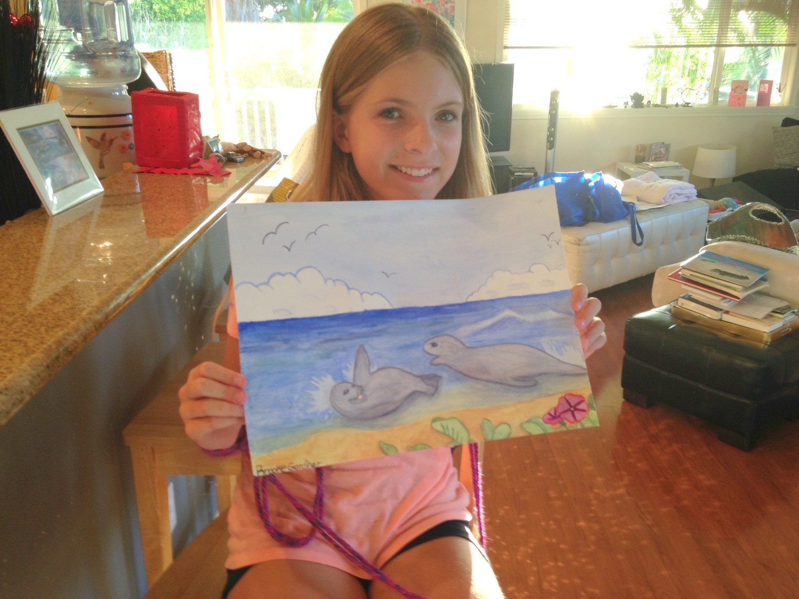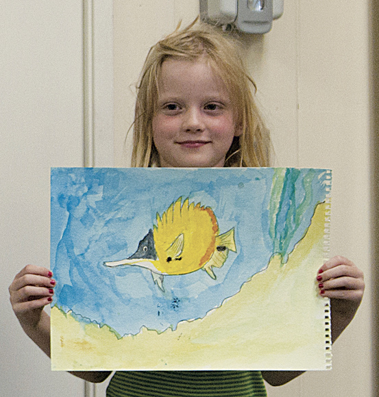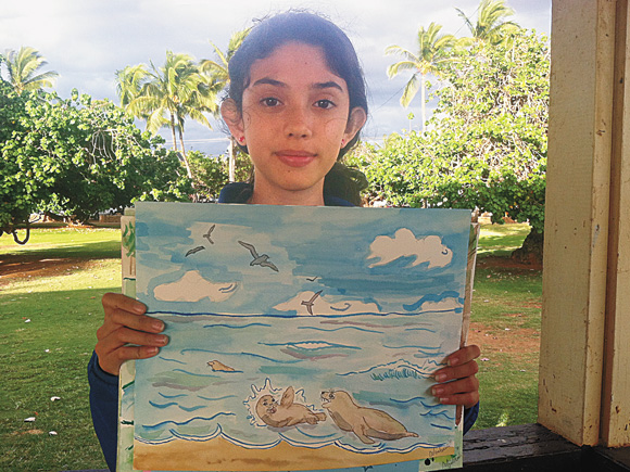 Riley Heime 7, a student at Montessori Hale O Keiki, displays her work of art that was recently on exhibit in Kihei. New Classes beginning soon. Call (808) 269-6845 for more information.